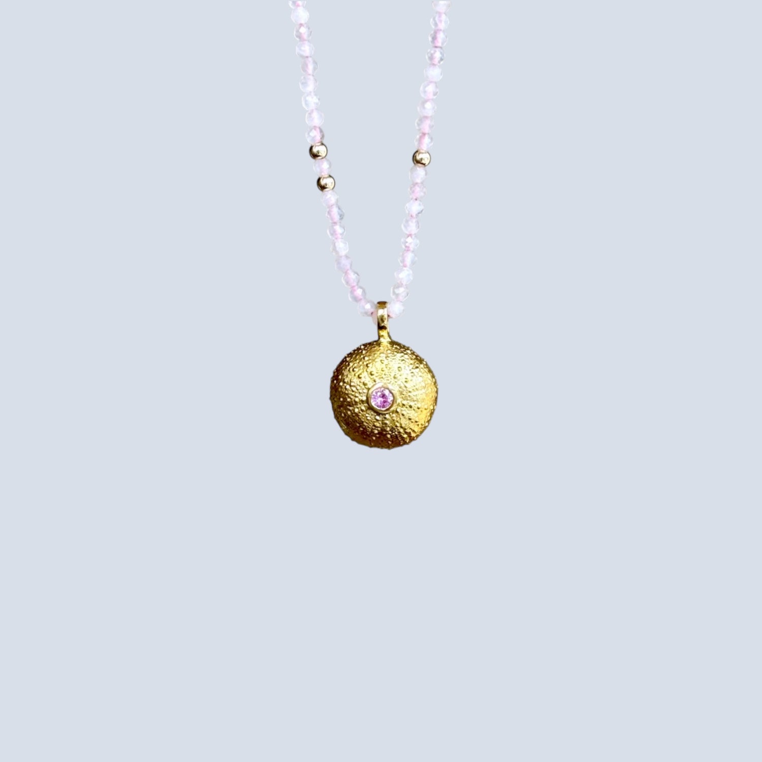 An 18 carat gold vermeil pendant featuring vivid 3mm precious gemstone in bezel style setting and suspended from an 18 inch beaded necklace.